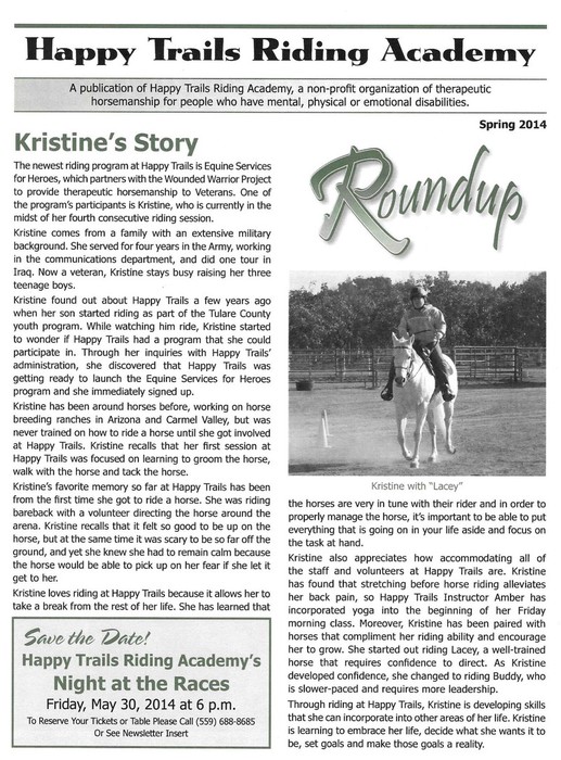February, 2013 - Happy Trails Riding Academy is excited to announce that we have officially launched our Equine Services for Hereos program. This program is a partnership between the Wounded Warrior Project and PATH, Intl., Happy Trails' accrediting organization.