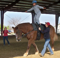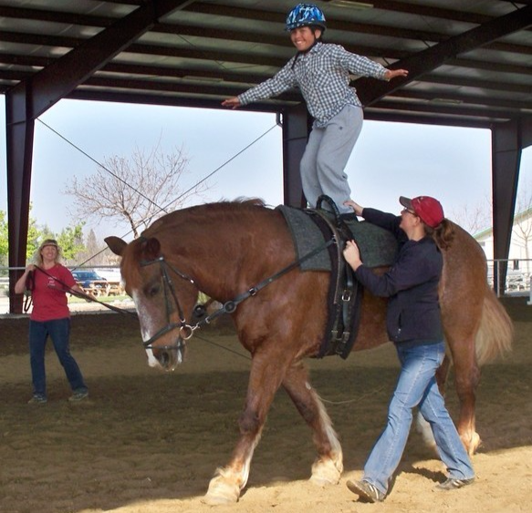 Brandon McDarment began riding with Happy Trails when he was just four years old. He suffers from Traumatic Brain Injury (TBI) that resulted in Brandon having a spectrum of challenges, so he started the Equine Assisted Activities / Life Skills class with Klara Bergtholdt, an occupational therapist and PATH, Intl. certified instructor. After a couple years of the EAT class, Brandon started Interactive Vaulting and now, at ten years old, Brandon says it's his favorite activity at Happy Trails. Brandon also says that his favorite vaulting position is the one that "makes me look like a starfish."